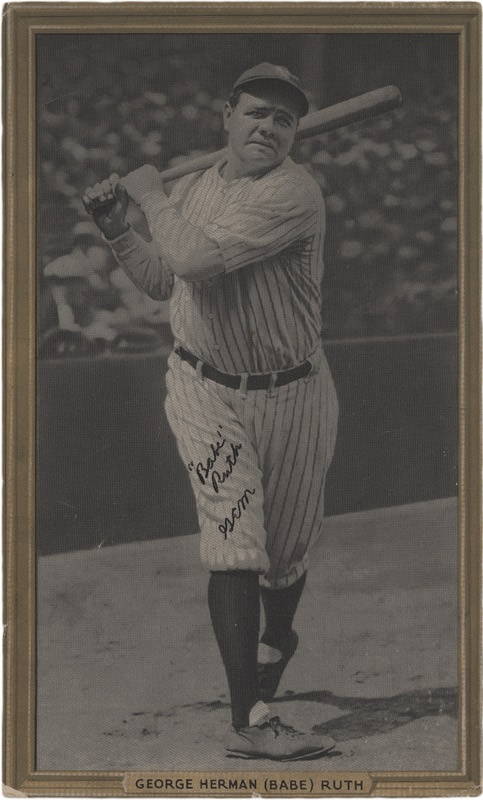 George Herman (Babe) Ruth card premium display piece issued by Goudey Gum Co., Boston, MA in 1934. Goudey was the first company to bring bubble gum baseball cards to the American marketplace. "Babe Ruth Gem" is written on the surface in ink. Some writing in pencil on the back. Minor nicks on the corners and sides. Mid Grade condition overall. Image is of the Babe swinging for the fences. The card's size is approximately 5 1/2" x 9", with original easel back intact for prominent display.