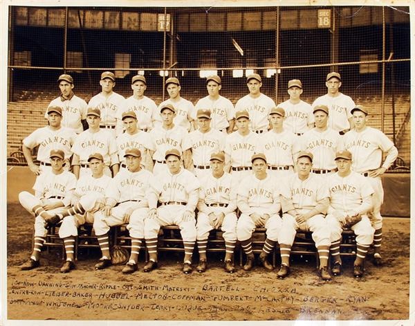 Original team photo of the National League Pennant winning 1937 NY Giants baseball squad. 11x14" photo taken during the season of 1937. They ultimately lost the World Series that year to the cross-town NY Yankees four games to one. Photo has some minor creases and a small tear on the top middle edge. Overall VG-EX. Team photo includes All-Star players Dick Bartell, Carl Hubbel, Gus Mancuso, Jo-Jo Moore, Mel Ott, Burgess Whitehead.