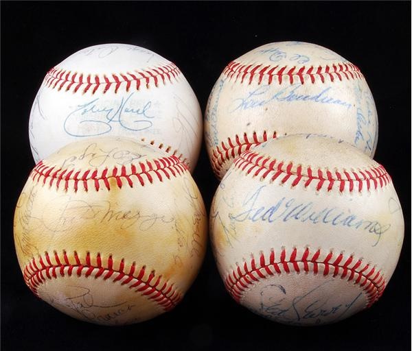 Nice collection of (4) multi-signed baseballs with hall of famers and teams. Official American League (Mac Phail) baseball signed by 15 members of the 1975 AL All-Star team including: Hank Aaron, Nolan Ryan, Al Dark (clubhouse), Jorge Ortega, Mike Hargrove, Rod Carew, Fred Lynn, Jim Kaat, Jim Palmer, Paul Linblad, Toby Harah, Dave Chalk, Gene Tenace-Nice, Bucky Dent (clubhouse), & Rich Gossage. Official National League (Giles) baseball signed by 24 members of the 1960 Cubs including Lou Boudreau on the sweet spot, Rich Ashburn, Ernie Banks, Frank Thomas, Dick Ellsworth, and Moe Drabowsky. Lightly toned with signatures rating solid 7. Official American League (MacPhail) game used baseball signed by (14) Dodgers and Red Sox including Ted Williams on the sweet spot and Carlton Fiske, Ron Cey, Jim Rice and Steve Garvey. Toned ball with some spotting on panels and signatures rate 5 to 8. Unofficial ball signed by hall of famers and stars including Joe DiMaggio on the sweet spot and Ernie Banks, Rollie Fingers, Ralph Kiner, Don Sutton, Joe Torre, Ed Lopat, Ralph Branca, and Bucky Dent. Toned ball has signatures rating 6 to 8. Lot comes with LOA from PSA/DNA.