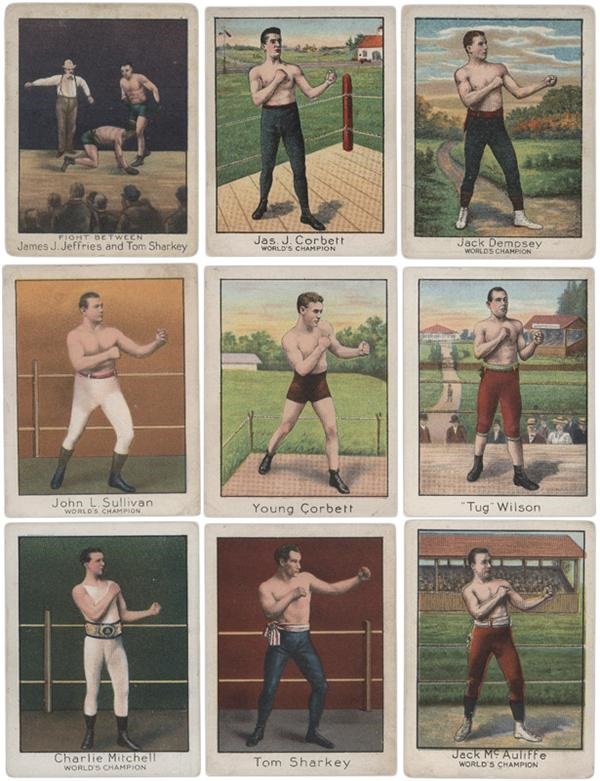 Complete set of 50 white border cards with three of the more scarce silver border cards included. Silver border cards include Coburn, Goldman and Randall/Belasco. Lots of big names in this set including John L Sullivan, Jim Jeffries, Joe Gans, Peter Jackson, and more. The set is a pretty consistent VG with a few better and a few worse.