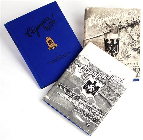 Includes the 1932 Album and two 1936 Albums housing a complete set of Olympic trading cards. The 1932 Album has the original Dust Jacket as does one of the 1936 albums. All of the cards are neatly pasted into their respective places and present NM-MT on the front. The set is interesting in that it features athletes such as Jesse Owens and Cornelius Johnson. Issued only in Germany. The dust jackets have some small tears and general overall wear. The Interior of the albums is clean wiht no missing pages. Fine overall condition.