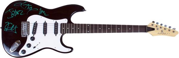 Karera STC-33 Guitar signed on body by the 4 members in a teal color marker. Includes James Hetfield, Kirk Hammett, Lars Ulrich and Janson Newsted. NM-MT.