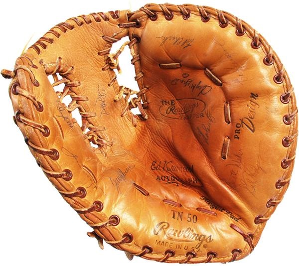 Rawlings Trapper Ed Kranepool model was vintage signed in ballpoint pen by 10 members of the 1969 Miracle Mets. Included are Gil Hodges, Nolan Ryan, Tom Seaver, Tommie Agee, Tug McGraw, Ed Kranepool, and more. Signatures average 6-7 out of 10. All signatures are in the pocket. Glove is EX.