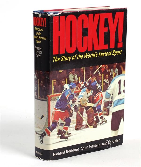 1969 "Hockey" 1st edition hardcover book signed by 16 players including Terry Sawchuk. Sawchuk died under mysterious circumstances in 1970 at age 40 a few weeks after an altercation with teammate and roommate (and pottery aficionado) Ron Stewart over Stewart removing their refrigerator from their home to make room for a pottery kiln. Condition of the book is near mint with very minor bumping on the spine of the hard cover and very slight discoloration on the back cover, pages in near mint condition and book jacket in VG/EX with some edge wear and minor edge tears. All signatures are mint and vintage signed in the early 1970's and include such hockey greats as Maurice "The Rocket" Richard, Bobby Orr, Phil Esposito, Doug Harvey, Bobby Hull, Gordie Howe and Milt Schmidt of the Bruin's famed "Kraut Line".