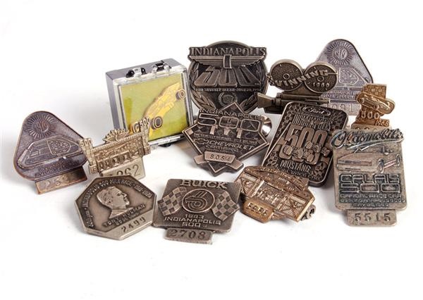 Collection of Indianapolis Motor Speedway auto racing pins (12). All are individually numbered. These were only given to members of the press attending the event and are very scarce. Includes 1956, 1962, 1968, 1969, 1970, 1974 (2), 1983, 1985, 1992, 1993, 1994 individually numbered pins. Also includes souvenir yellow Indy race car pin.