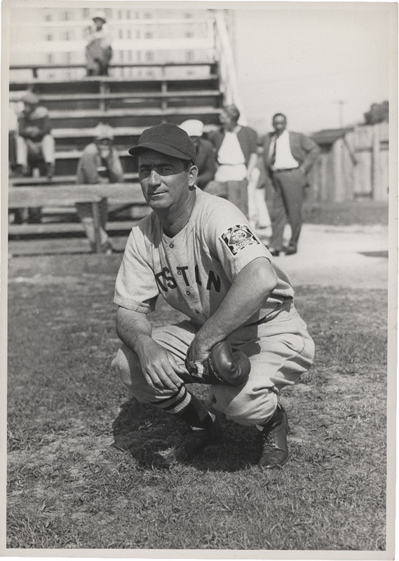 This 1939 photograph of Red Sox catcher, Moe Berg, is in such great condition it looks as though it could have been taken a year ago rather than almost 70! The 5x7 image is remarkably clear. So much so, that it is quite easy to read the words on the Baseball Centennial patch stitched to the left sleeve of his uniform.