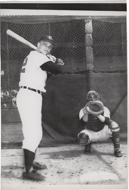 This original wire photo shows Roger Maris batting during his rookie season with the Cleveland Indians. However it was with the NY Yankees that Maris will always be remembered. This 6" x 9" Cleveland Press photo is in EX-NRMT condition with some minor corner creases. Maris broke Babe Ruth's single season home run record of 60 by hitting his 61st homer in 1961 at Yankee Stadium versus Tracy Stallard and the Boston Red Sox. It was the final game of the year and the call was famously made on television by Phil Rizzuto.