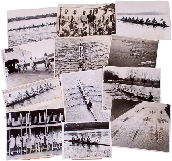 Rowing photographs (450+) from the 1920's through the 1980's. Includes lots of competitive rowing action. Photos range in size from 5” x 7” to 9” x 12” with many 8” x 10”. Conditions range from GD-MT with many EX. Some have newspaper edit markings. Many have original newspaper clippings taped to the back. Collegiate teams represented in this collection include Universities of California, Oregon, Washington, Wisconsin as well as Stanford, Columbia, Princeton, Harvard, Yale, Cornell and Pennsylvania.
