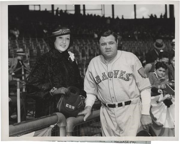 Singing star of stage, screen and radio Ethel Merman greets the great Bambino in this 1935 photo just before the Babe is to take the field for the Boston Braves. Merman was one of the biggest recording stars of the time. Photo is 8" x 10" and is in EX/NRMT condition with just a 1/4" tear along the top edge. Babe was in New York to play the NY Giants. He was making his first NY appearance in a Braves uniform after his legendary stint with the Yankees.