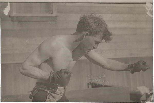 Oscar "Battling" Nelson was the lightweight champion of the world on two separate occasions in the early 1900's. This original photo, by Dana Studio, San Francisco, and blind embossed with their logo, is 6 1/2" x 4 1/4". It is in NRMT condition with a few corner blemishes transferred over and visible from the original glass negative. Nelson fought 135 fights, won 73 including 40 by KO, lost 30 and fought 24 draws. He died in poverty in 1954. In 1992 he was elected to the International Boxing Hall of Fame.