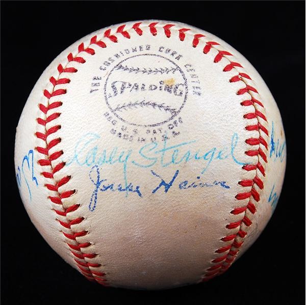 Official National League Feeney Baseball signed by nine old timers including, Casey Stengel, Jesse Haines, Paul Dean, Chick Hafey, Bill Dickey, Tom Henrich, Walker Cooper and Ray Blades. Signatures are "7.5-9" on scale of 1-10.