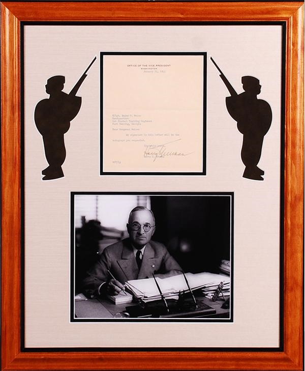 Typed letter on "Office of the Vice President" stationary in response to an autorgaph request. Dated Jan 22 1945. Custom matted with a modern print of Truman. Framed to 18.5 x 22.5''.