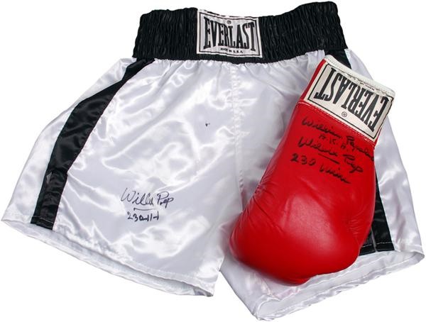Lot # 50: Willie Pep Signed Boxing Trunks and Glove (2)