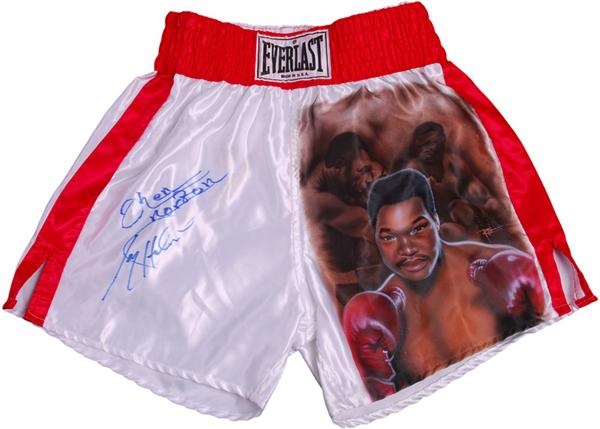 Lot # 52: Larry Holmes and Ken Norton Signed Hand Painted Boxing Trunks