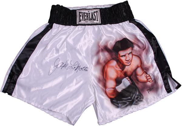 Lot # 48: Jake LaMatta Signed Hand Painted Boxing Trunks