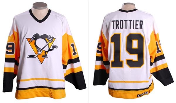 Home white jersey is all original with name sewn on a shoulder-to-shoulder plate on the back. Number 19 on back and both sleeves. Maska tag in collar has size (52) written on it in ballpoint pen. "19" also written on the tag in marker. From the Penguins first Stanley Cup winning season ever. No use at all.
