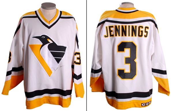 Home jersey is all original with name sewn on a plate on the back. Number 3 on back and both sleeves. CCM size 54 tagging in the collar. Number 3 written on the tag in marker. Moderate use with stick marks, split at the "V" neck, and light pilling inside.