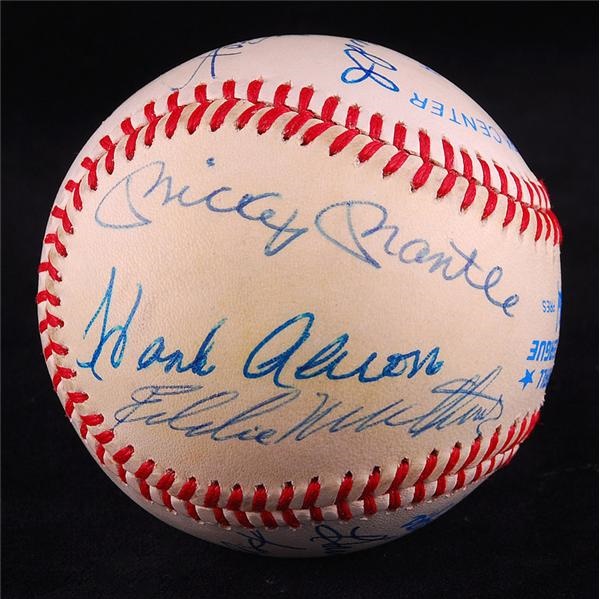 Official American League MacPhail ball with 11 total signatures including Mickey Mantle, Ted Williams, Hank Aaron, Eddie Mathews, Harmon Killebrew, Reggie Jackson, Frank Robinson, Mike Schmidt, Willie Mays, Willie McCovey, and Ernie Banks. All are signed in mint blue ballpoint. Ball is just off-white in color.