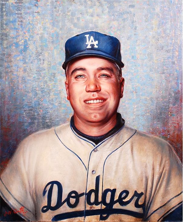 Orth was one of the last artists from the Santa Anna, California area to paint in the style of the Old Masters. His forte was always portraiture of well known persons, as you can well see from this fine example. Some of the artist's most notable subjects included Winston Churchill, Charles Laughton and Albert Einstein. This acrylic masterpiece, worthy of Cooperstown and of the highest quality both in form and condition
