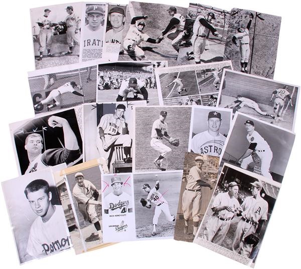 Mega baseball photo collection (450+) including photos of greats Ted Williams and Joe Morgan. Photos range in size from 2" x 3" to 8 1/2" x 12" and are in varying grades from GD-NRMT. Other wire photos show Walt Dubiel, NY Yankee hurler, as he was traded to the Seattle franchise of the Pacific Coast League. Giants infielder Hal Lanier and Bobby Bonds pictured in 1969, Red Sox manager Mike "Pinkey" Higgins, as well as Cubs star from the 30's- 40's Lon Warneke. Oriole's manager Billy Hitchcock is the subject of several shots, as is Pittsburgh Pirates pitcher Vernon Law. There is also an interesting shot of Dwight Eisenhower shaking hands with Preston Bruce, Jr., who had just signed with the Pirates, as his father, well known White House doorman Preston Bruce, Sr., who served under 5 U.S. Presidents from Eisenhower to Ford, looks on.