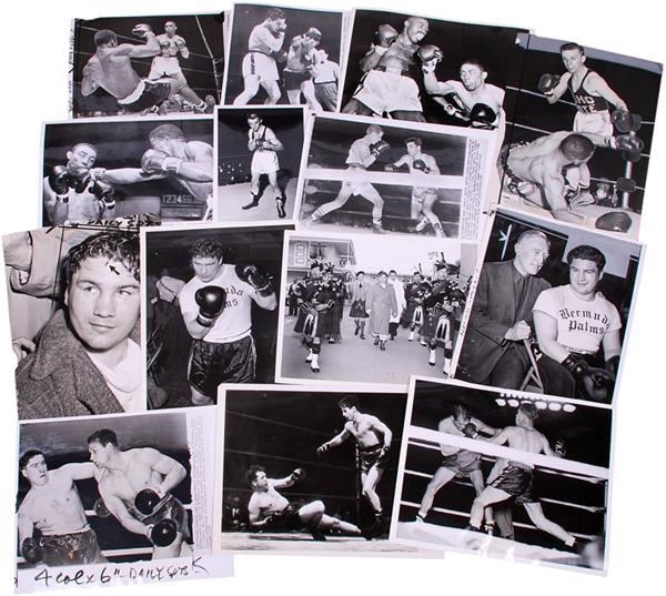 Large collection of vintage boxing wire photos (450+). Lot dates from the 1920's thru 1980's. Photos of Evander Holyfield, Eddie Chavez, Larry Holmes, Andre Lenglet, Joe Brown, and Amos Lincoln. Sizes range from 4" x 6" thru 8 1/2" x 12". Condition ranges from VG-NRMT.