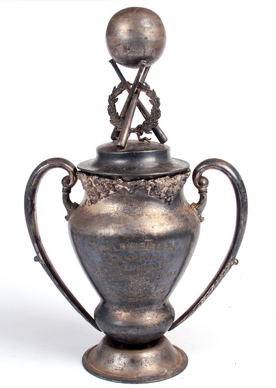 18'' tall metal trophy engraved "Spalding Trophy / Champions / Franklin County / Amateur Baseball League / 1909 / Won by / Brushton." Ornate figural lid with ball and bats. Floral pattern around the rim and handles. A hallmark and the numbers "249" are stamped on the base. Some minor bends and materal loss to the surface/finish. Overall VG.