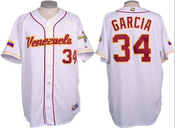 White knit button-down with "Venezuela" sewn on front in maroon tackle twill, outlined in gold. Maroon braid sewn down the front, gold braid around the arm openings. Matching #'s sewn under the left breast. Reverse has larger matching numbers with matching NOB sewn above. The WBC logo patch is sewn above the name. Right sleeve has the Venezuelan flag patch, left sleeve the Maltin Polar sponsor patch. WBC/Majestic tag sewn on the front left outer tail, 0062 WBC code stamped on the wash tag.