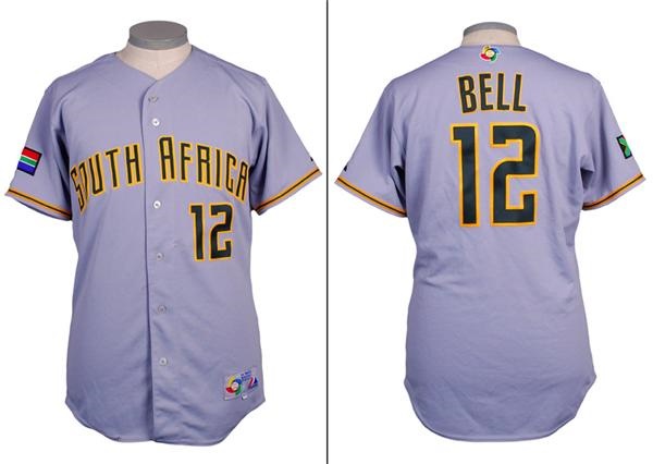 Grey knit button-down with "South Africa" sewn on front in dark green and gold lettering. Sewn under the left breast, matching #'s. Reverse has larger matching #'s with NOB in matching 2-tone sewn above. WBC logo sewn above. Gold and green braid sewn around the cuffs. Right sleeve has the South Africa flag patch, left sleeve Majestic logo ebroidered in green. 0062WBC code on the wash tag.