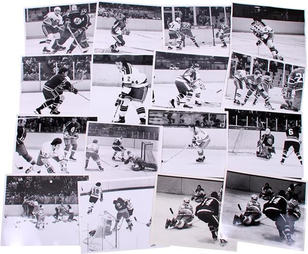 Over 100 New York Rangers game action hockey photos dating from about 1970-1976. A handful are wire photos, but the vast majority were taken by staff photographers for a New York area newspaper such as Bob Pisano and Paul Demaria. Most of the action is centered around the goalies, but there are also several photos of fights. 8 x 10''. NM-MT.