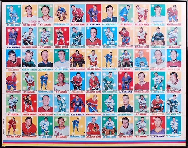 Uncut sheet of 66 cards. Includes Brad Park, Stan Mikita, Serge Savard, Rod Gilbert, Bobby Orr, Gordie Howe, Frank Mahovlich, Bernie Parent, Yvan Cournoyer and more. A few of the cards have light wrinkles, but most present NM-MT. Framed.