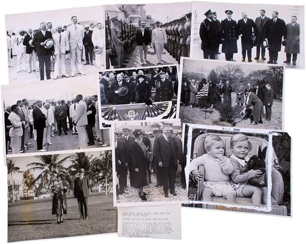 About 15-20% of the lot features some great shots of Hoover (nice quality), the remainder of the lot is keyed to his sons. The photos of the President date from the 1920's and 1930's, the photos of his sons date from the 1920's to 1960's. There are also some related pictures of Hoover's home and a medal made in his honor. Sizes vary. Overall Excellent