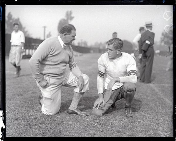 The late 1920's/early 1930's was the time, the gridiron is the place, and Claude "Tiny" Thornhill/ Glenn "Pop" Warner are the subject of this collection of negatives (10), three of which are glass plate. All are 4" x 5" and range in condition from EX-NRMT. Also pictured is Mrs. Thornhill.