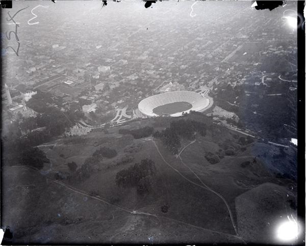Collection of 1931 UC Bears Football Stadium photo negatives (5). Sized at 4" x 5", one of the five is glass. They are in EX-NRMT condition. The capacity filled stadium is is the subject of one image taken in 1931 versus Stanford. Another early 1930's aerial shot shows the Sather Campanile Tower with the football stadium tucked into the hillside behind the tower.