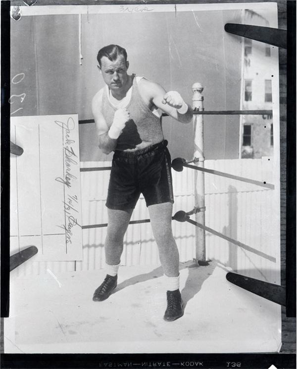 Collection of boxer Jack Sharkey negatives (4). Sharkey, known as the "Boston Gob" was the heavyweight champion, winning the title after he knocked out the former light-heavyweight champion Tommy Loughran to win the United States heavyweight title in 1929. Negatives are 4" x 5" and in NRMT condition. They show Sharkey in various boxing poses during working sessions. One of the negatives is glass plate.