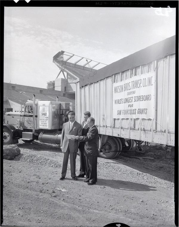 Collection of newspaper negatives of the construction of Candlestick Park in San Francisco. Negatives are 4" x 5", and in NRMT condition with some edit markings. Include shots of a giant model of Candlestick and the new scoreboard as well as the actual phases of construction of the stadium.
