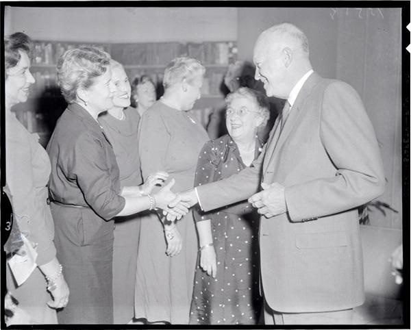 Collection of newspaper negatives (125+) of President Eisenhower from 1958. Negatives are mostly 4" x 5" in size with some at 2 1/4". Most are in NRMT condition. Images are of him arriving at Marina Green in San Francisco by Marine Helicopter and at SF Airport via his plane "Columbine" as well as his arrival and speech at the SF Civic Auditorium.