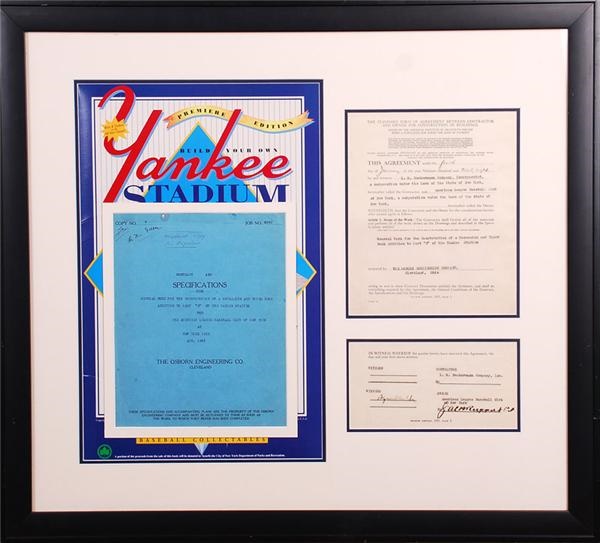 Beautiful large framed "form of agreement" for construction at Yankee Stadium between L.M. Neckermann Company, Inc., representing the Osborn Engineering Company, Cleveland, and Jacob Ruppert, owner of the New York Yankees. Neckermann was hired for construction of a mezzanine and upper deck to "Part D" of "The Yankee Stadium" as it was formerly known, January 4, 1928. The contract is signed by both the owner of Neckermann and the owner of the Yankees, Mr. Jacob Ruppert. Beautifully presented in a 28 1/2" x 26" black frame. Also includes the separate entire written contract for the project. Contract is typed with some hand written annotations.