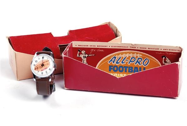 Perfect "All-Pro Football Wrist Watch" in its original box. The watch has a silver-tone casing and a brown leather strap. The face has a football graphic with the signatures of the era's favorites: Mike Ditka, Jim Taylor, Jim Brown and Y. A. Tittle. It was manufactured by Bradley Time Division in 1964 and is mint. The original box with display insert is included and in VG/EX condition.