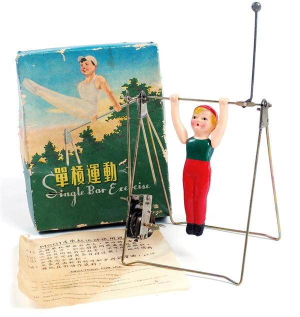 Wonderful Japanese wind up toy from the 1950s in its original box. The mint condition single bar exercise wind-up toy features a 6" figure on a 6x7" bar with wind up mechanism that sends him twirling around. The original box is VG/EX with charming graphics and text in both English and Japanese. Original instructions also included.