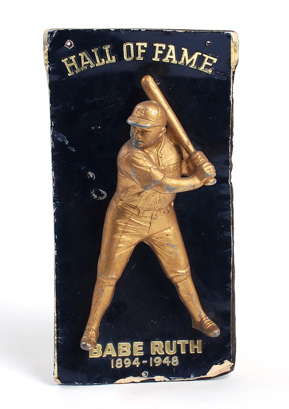 In 1957 Red Top Brewing Co. created an advertising display series featuring hall of fame athletes. This one depicts the great Yankee slugger, Babe Ruth. The display features an 8" metal figure of Ruth, painted gold and mounted on a black coated cardboard sign measuring 5.5 x 10.5". The sign also had embossed gold lettering and a sticker on the back giving Ruth's baseball biography. The display piece has hanging holes in the top corners and on the bottom edge. The edges show quite a bit of wear and the cardboard is separating into layers, especially at the corners. The figure itself has a bit of the paint worn off at the elbow, hand, toes and hat brim. Overall, though, this is a great looking vintage display and fine piece of Ruth memorabilia.
