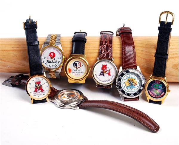 Nice variety of (7) limited edition college championship watches including football and basketball. The watches were given out to players, coaches and staff as well as being sold in limited numbers at the stadium. Includes: University of Kentucky 1998 NCAA basketball champs watch; 1985 University of Oklahoma Orange Bowl champs watch; 1992 Florida State football champs watch; 1993 Alabama football champs watch; 1994 Arkansas football champs watch; 1995 University of Florida football champs watch; 1998 Tennessee football champs watch. All watches have had new batteries installed and are NM/MT condition.