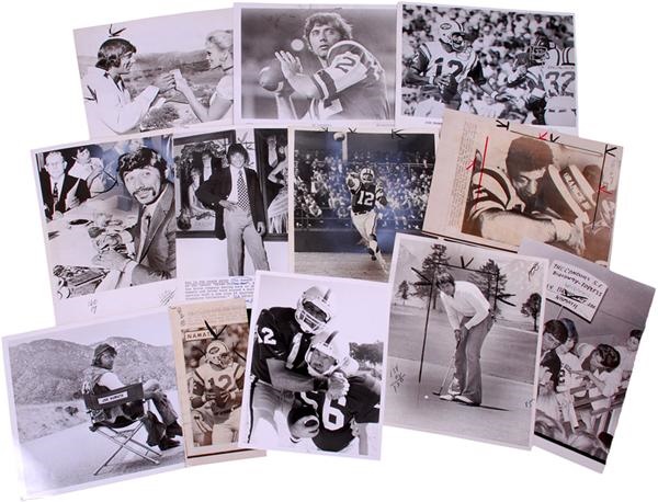 Broadway Joe Namath is the subject of this photo collection (15). Sizes range from 4" x 8" to 8" x 10" and are in various conditions from GD-NRMT. Shots depict game action and his well documented social life. One photo shows Namath and Ann-Margaret toasting to their upcoming movie. Another laser wire photo shows him hugging his father after his 16-7 Superbowl III victory over the mighty Baltimore Colts.