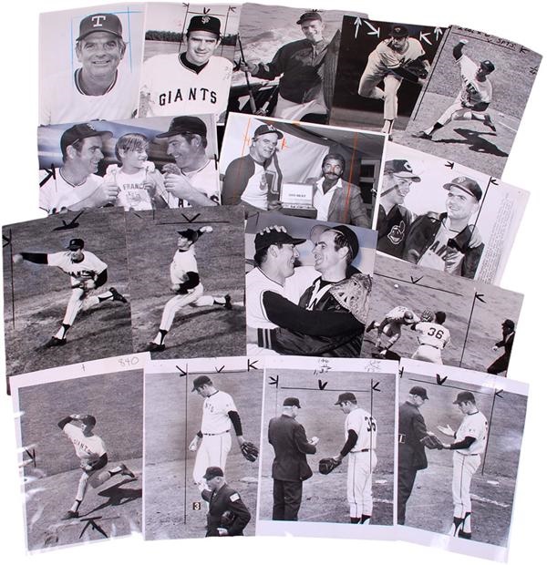 Notorious spitball pitching HOFer Gaylord Perry is the subject of this collection of news service photos from the 1960's and 1970's. Sized from 7" x 9" to 8" x 11" and in VG-EX condition with some newspaper edit marks, these images chronicle the career of Mr. Perry. Perry is one of only 4 pitchers in history to have won the Cy Young award in both the American and National leagues. Three of the photos depict a 1969 sequence in which umpire Doug Harvey is at the mound, inspecting a ball for signs it was one of Perry's infamous spitballs. All he found on the ball was Warren Giles autograph! Perry was not actually ejected from a game for the offense until 1982, 21 years into his career!