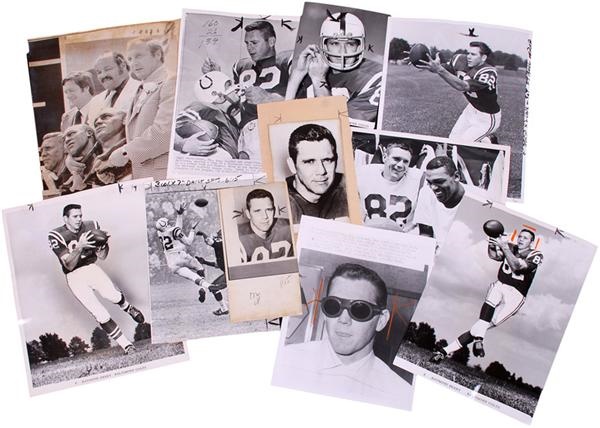 Baltimore Colts wide receiver Raymond Berry is the subject of this collection of 1950's and 1960's news service photos (11). Sizes range from 5" x 7" to 8" x 10". Conditions range from VG-EX. Berry played on two Colts Championship teams. One of those championship teams played in "The Greatest Game Ever Played" in 1958 versus the NY Giants in Yankee Stadium. The Colts prevailed in OT, 23-17, thanks to a championship-record 12 passes caught for 178 yards and a touchdown by Berry. During the Colts' final game-winning drive in overtime, Berry had two key receptions for 33 yards.