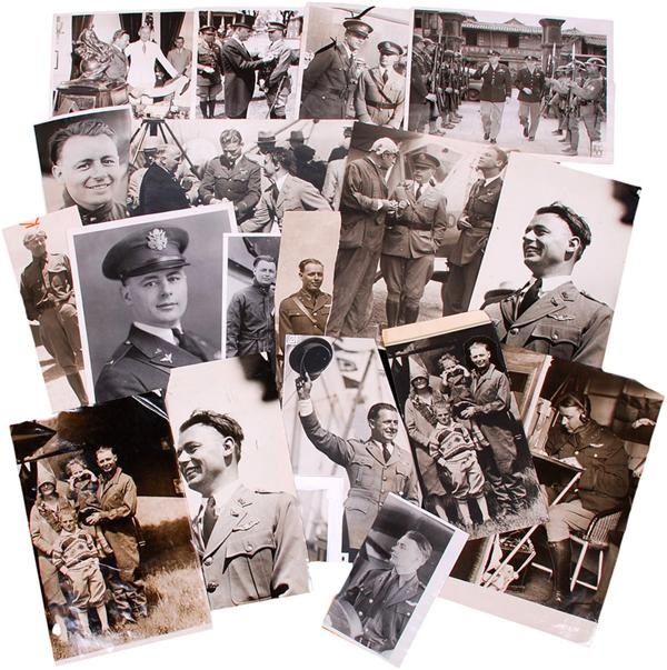 Historic wire photo collection (57) of aviator Albert Hegenberger. Mr. Hegenberger, an MIT grad, set a flight distance record in 1927 by flying 2400 miles from California to Hawaii. Photos range from 3" x 7" to 8 1/2" x 11" and are in various conditions ranging from GD-NRMT. One of the marquee photos (in EX condition) shows Hegenberger shaking hands with President Franklin Delano Roosevelt as he is presented the Collier Trophy in 1935 for his contributions to "blind flying" and "blind landing".