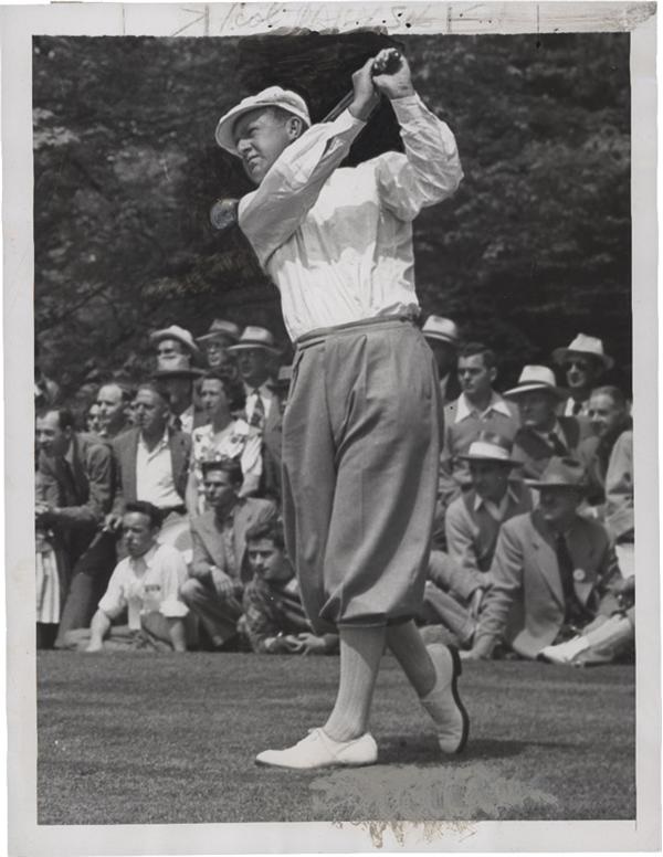 Bobby Locke, great South African golfer and 4 time British Open champion is the subject of this collection of wire photos (14). Sizes range from 7" x 5" to 8 1/2" x 12". Conditions range from GD-NRMT with many in EX. Several game action shots from Tam O'Shanter. A great photo shows Locke at the 1949 British Open at St. George's Course which he won in a playoff versus Irishman Harry Bradshaw. Locke was involved in a serious car accident in 1959 which ultimately put an end to his career. He was elected to the World Golf Hall of Fame in 1977. He was the first non U.S. or U.K. player to be elected.