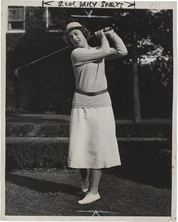 This collection of news service photos (66) features the greatest female golfer of the 1920's and 1930's Glenna Collett Vare. Photos range from 4" x 6" to 8 1/2" x 11 1/2". Conditions range from VG-MT, with many NRMT. Many photos are of her with her family as well as several of her in game action and with her teammated from different Curtis Cup teams. One is of her as the Curtis Cup team captain receiving the cup after her American team defeated the English team 6 1/2 to 2 1/2 in 1948.