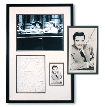Gathered by the son of an industry employee during the Golden Age of television, the blue ball-point signatures of "The Great One" and his comedic partners on individual pieces of paper have been glued or taped onto a single sheet of lined paper from a spiral notebook. In addition to Jackie Gleason, Audrey Meadows, Art Carney, and Joyce Randolph, we also have Jack Lesculi and Ray Block (pencil). A photo card of Jackie signed in blue fountain pen rounds out this wonderful tribute to these television pioneers. Framed with a classic 11x14" photo.