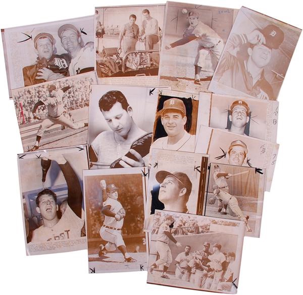 Mickey Lolich of the Detroit Tigers is the subject of this collection of laser wire photos (25). They span the late 1960's through the 1980's. Includes some from the historic 1968 season. They range in size from 5 1/4” x 7” to 8 1/2” x 11”. These are laser photos and are in GD-EX condition. One of the photos is of Lolich with teammate Al Kaline after they helped lead the Tigers to victory in game five of the 1968 World Series. Another shot shows Lolich shaking hands with and being congratulated by President Richard Nixon. Lots of other game action shots.