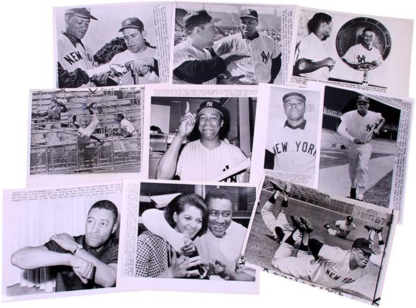 Elston Howard is featured in this news service photo collection (16) from the 1950's and 1960's. Howard played both catcher and outfield for the New York Yankees. Photos range in size from 5” x 8” to 8” x 10”. They are in EX-MT condition. He was the first african american player on the Yankees and AL MVP in 1963. He was also an all-star nine consecutive years from 1957-1965. Howard is credited with inventing the batting "donut," a circular weight used by batters in the on-deck circle. Howard's number 32 has been retired by the Yankees and he has a plaque in his honor in Yankee Stadium's Monument Park.